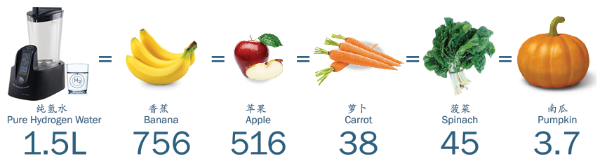 Drinking 1.5L of hydrogen water has the same antioxidant effects as consuming fruits and vegetables shown below :